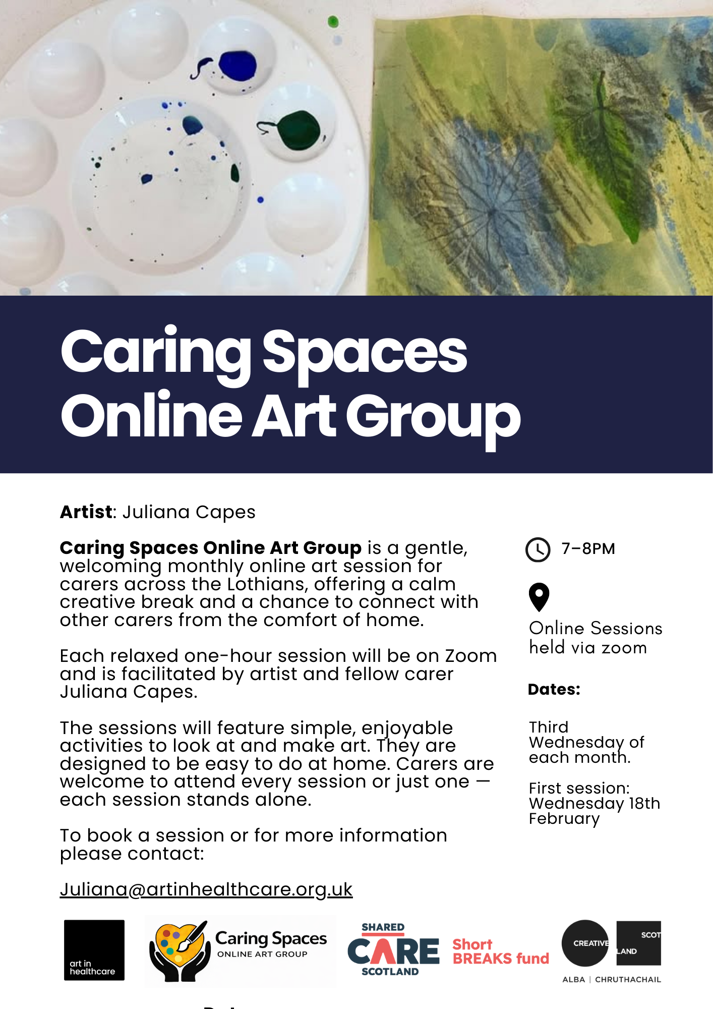 Caring Spaces Art Club is a gentle, welcoming monthly online art session for carers across the Lothians, offering a calm creative break and a chance to connect with other carers from the comfort of home. Each relaxed one-hour session is facilitated by artist and fellow carer Juliana Capes and features simple, enjoyable art activities designed to be easy to do at home. Carers are welcome to attend every session or just one — each session stands alone. A short list of materials needed will be emailed in advance, and any carers who would benefit from having materials posted to them are very welcome to request this, so everyone can take part with ease.