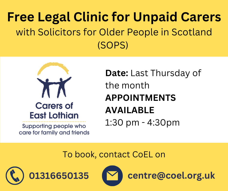 Our Legal Advice Clinics for unpaid carers take place on the last Thursday of every month. The clinic is open to ALL carers, regardless of age, including parent carers. The clinic offers carers 30-minute telephone appointments for FREE legal advice on the following issues: