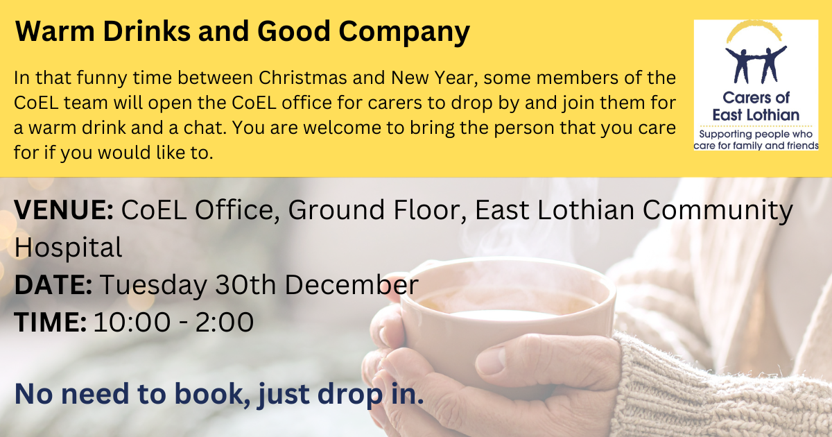 Don’t forget that our office will be open on 30th December in between Christmas and New Year for warm drinks and good company. We will open between 10 and 2 and Gemma and Suzie will be in the office to welcome you warmly with warm drinks and refreshments. There is no need to let us know if you are planning to come along, just drop in when you feel like it. You can find us on the ground floor of East Lothian Community Hospital.