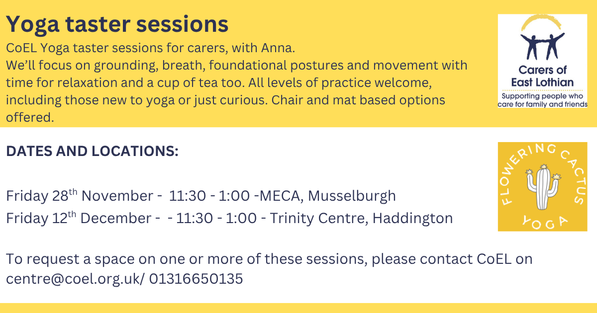 Anna is offering two yoga taster sessions for carers. Anna says: “We’ll focus on grounding, breath, foundational postures and movement with time for relaxation and a cup of tea too. All levels of practice welcome, including those new to yoga or just curious. Chair and mat based options offered.”